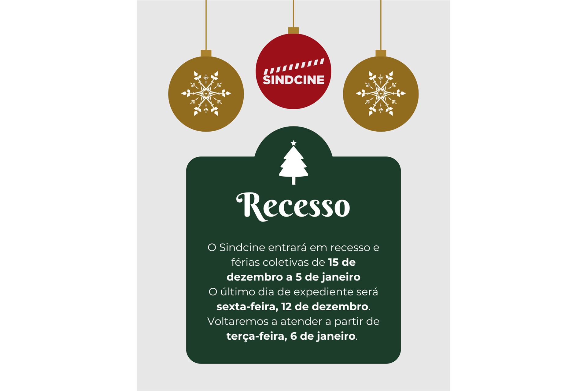 Recesso de Fim de Ano 15/12/2025 a 5/1/2026 O Sindcine entrará em recesso e férias coletivas de 15 de dezembro a 5 de janeiro. O último dia de expediente será esta sexta-feira, 12 de dezembro. Voltaremos a atender a partir de terça-feira, 6 de janeiro.