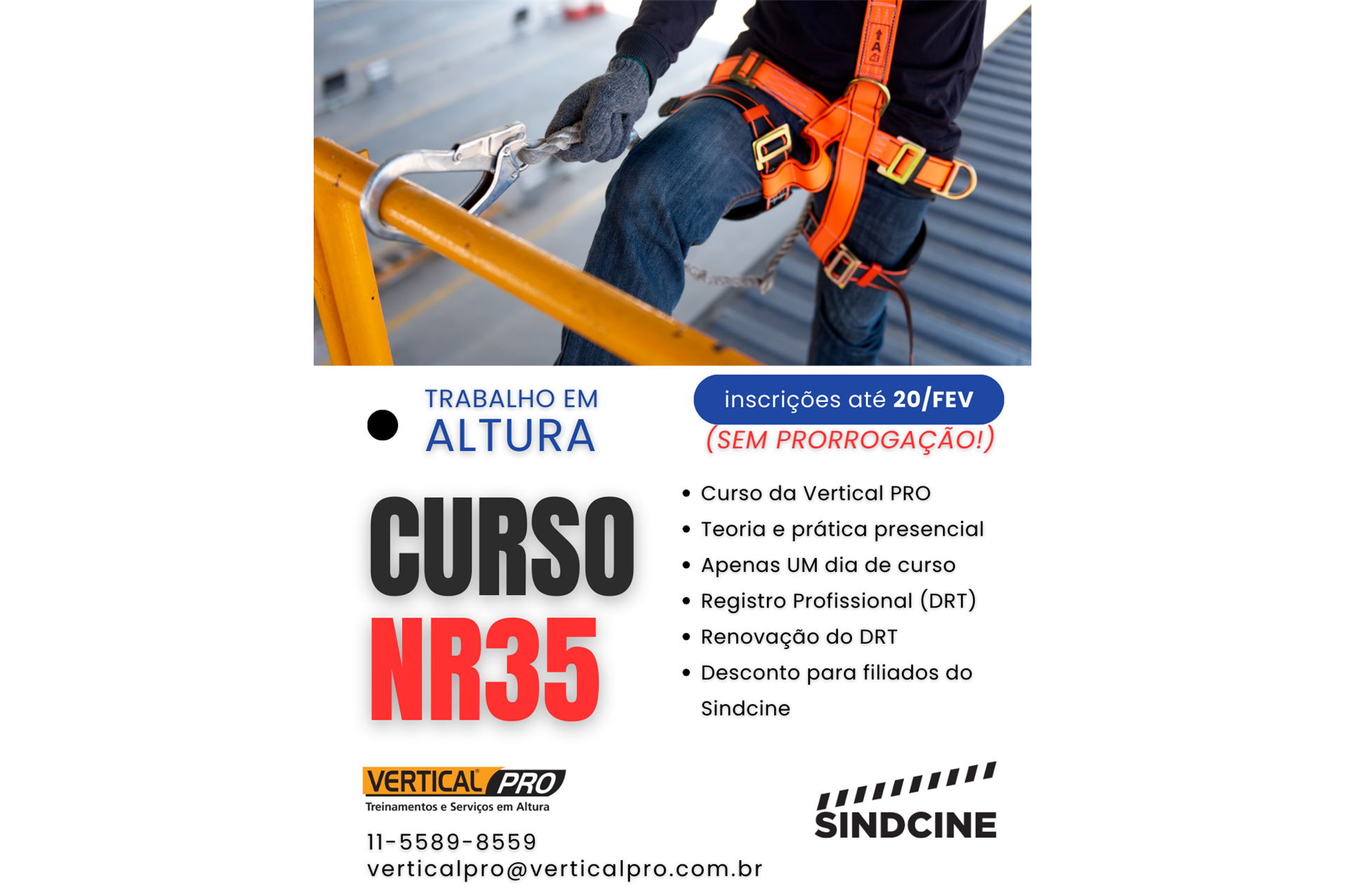 Primeiro curso NR 35 do ano na Vertical Pro! Quem está no processo de regulamentação profissional do Sindcine tem a oportunidade de fazer o curso com desconto!