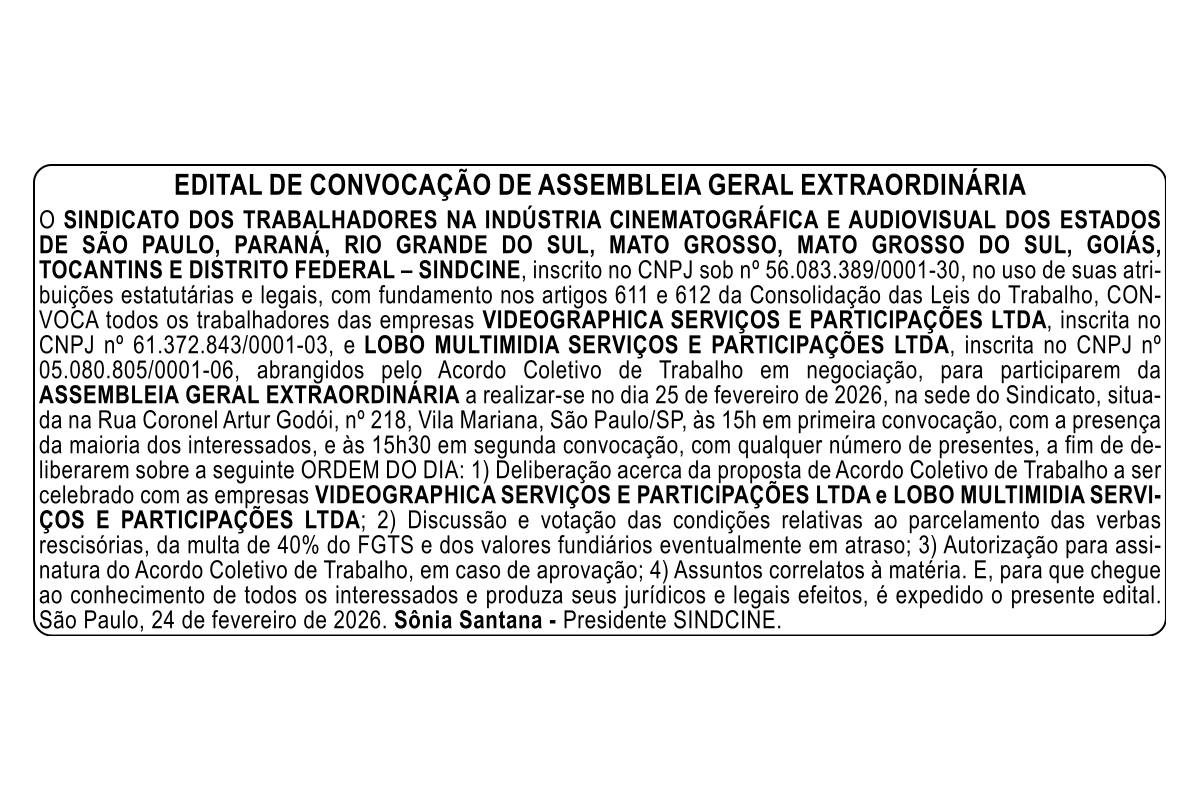 ASSEMBLEIA GERAL EXTRAORDINÁRIA a realizar-se no dia 25 de fevereiro de 2026