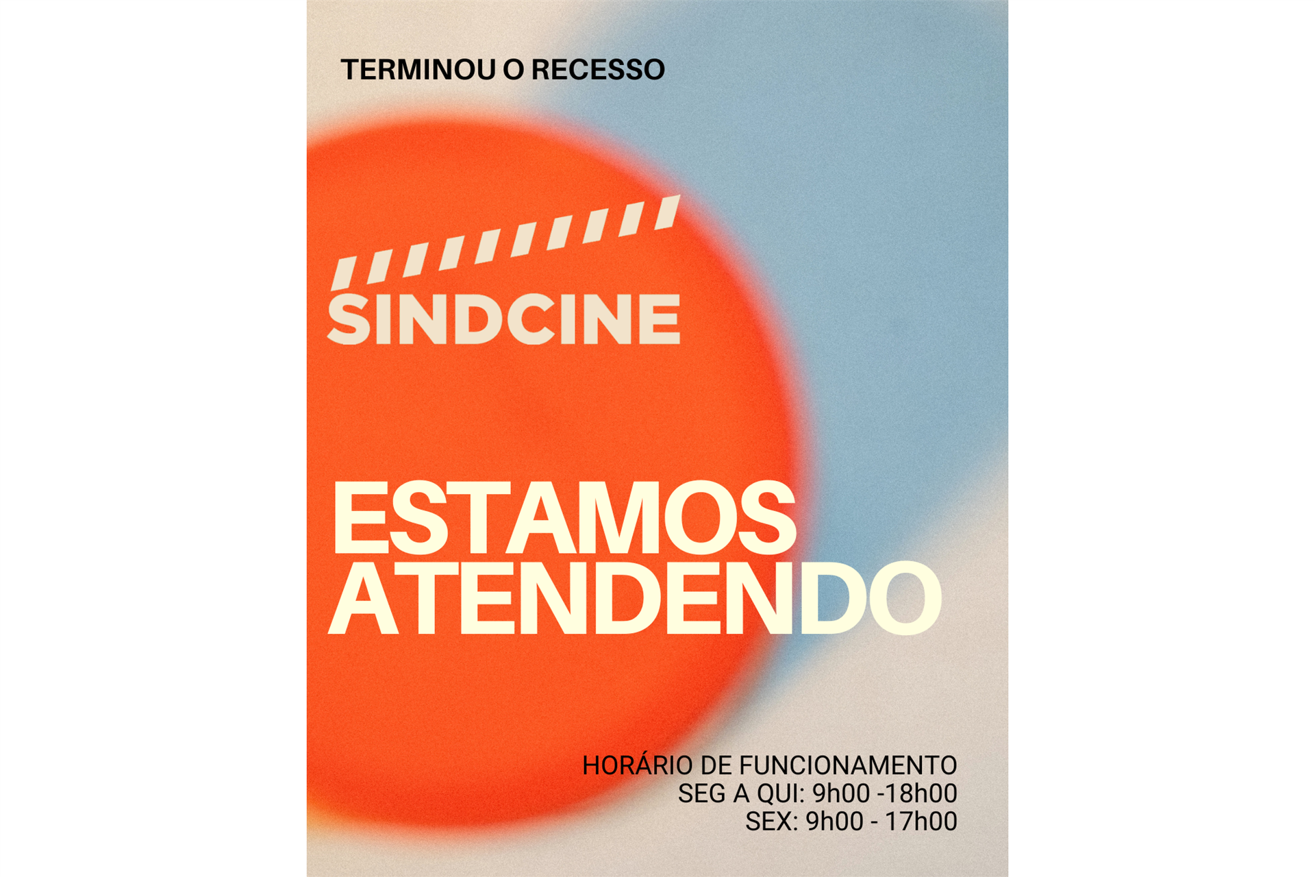 Terminou o recesso de fim de ano e o Sindcine está atendendo em horário normal, de segunda a quinta da 9h00 às 18h00 e sexta das 9h00 às 17h00. Feliz 2026 para todos, com muita saúde e trabalho!
